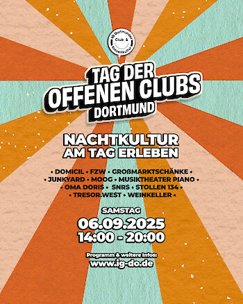08.08.25 | Am 06.09.2025 veranstaltete die Interessengemeinschaft zum ersten Mal den Tag der offenen Clubs. Insgesamt 11 Dortmunder Locations öffneten schon tagsüber ihre Türen und präsentieren ein buntes Programm aus Performances, Workshops und Panels. Ein besonderes Highlight ist die Talkrunde der Kandidat*innen für das Amt des Oberbürgermeisters im Oma Doris, die auch im Stream übertragen wurde.